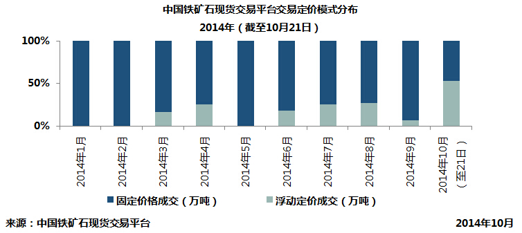 定价模式方面,2014年来平台浮动定价交易数量显著攀升,截至10月21日共成交226万吨,占总成交量23.1%,固定价格成交752.64万吨,占比为76.9%。结合年内铁矿石价格走势分析,3月、8月和10月等价格波动较大的月份中,浮动定价交易占比较大。