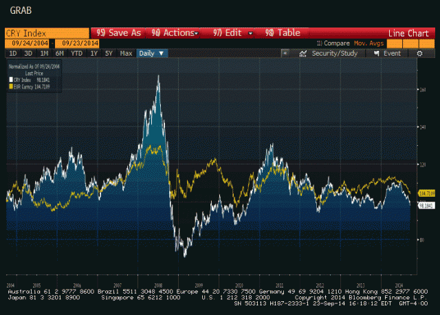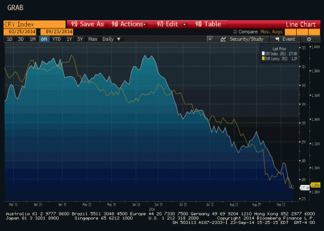 欧元对美元自6月以来下跌已经超过800点,欧洲央行的降息和负利率政策被认为始作俑者。与此同时,大宗商品也是一路向南跌跌不休,两者在过去6个月保持了惊人的同步性!